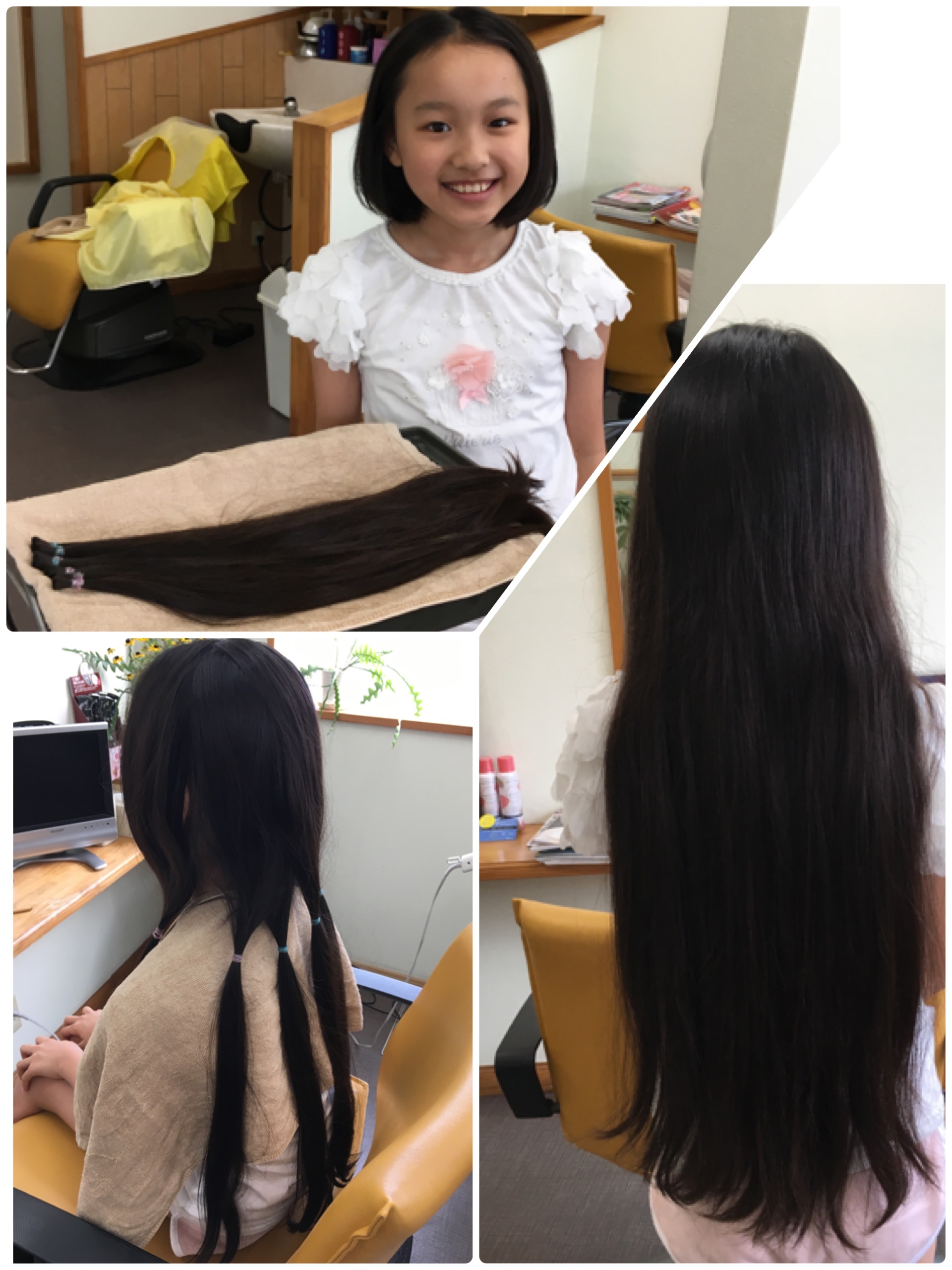 他にもヘアドネーションする子がいるそうで、「私も!」と髪を伸ばしたそうです。お尻まで伸びた髪を肩まで切った彼女は「軽い!」「可愛い!」とご機嫌♪♪ とても良い笑顔でした。