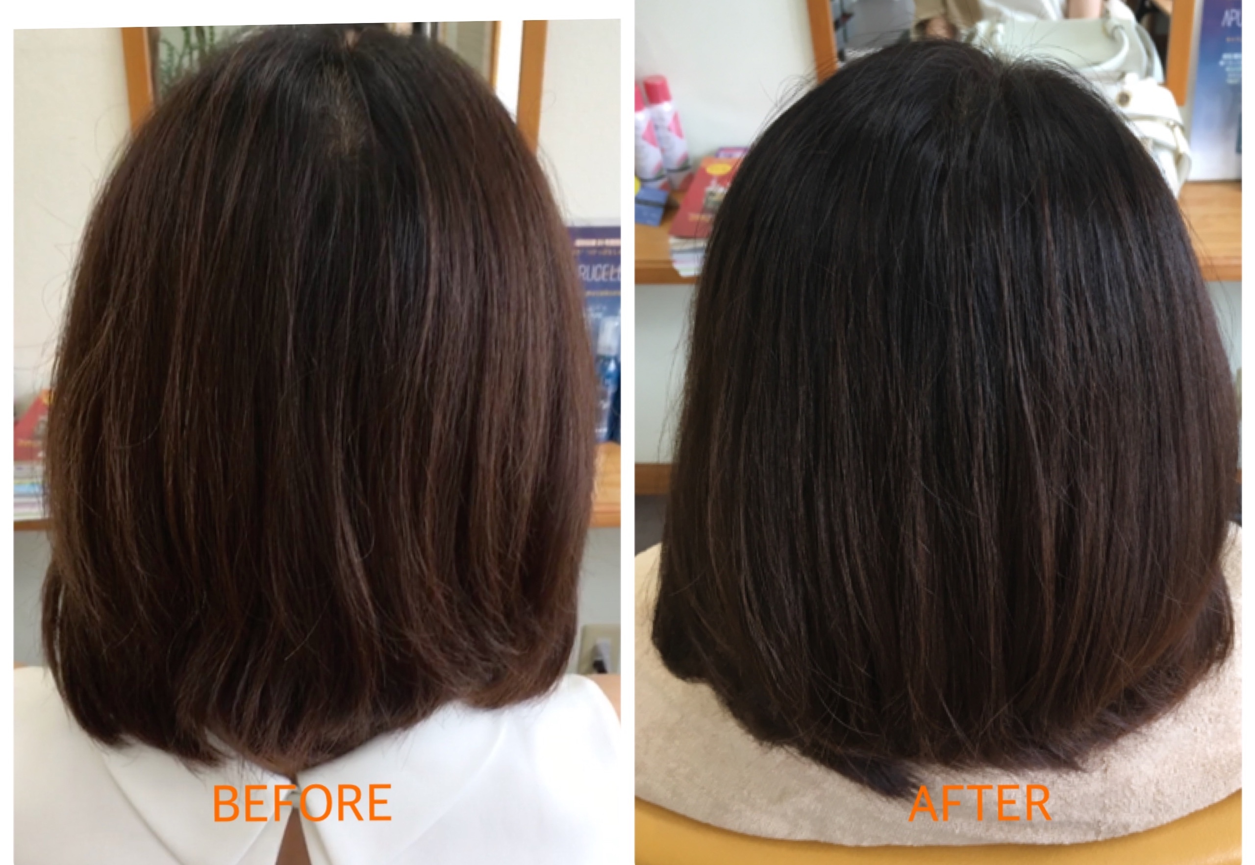 《香草カラー》のトリートメント効果でウネリがなくなりフンワリまとまりやすくなりました。プラス《ヘアループ》でつむじのパカっと割れをカバー!毎日のスタイリングが楽になりそう♪と喜んで頂きました☆